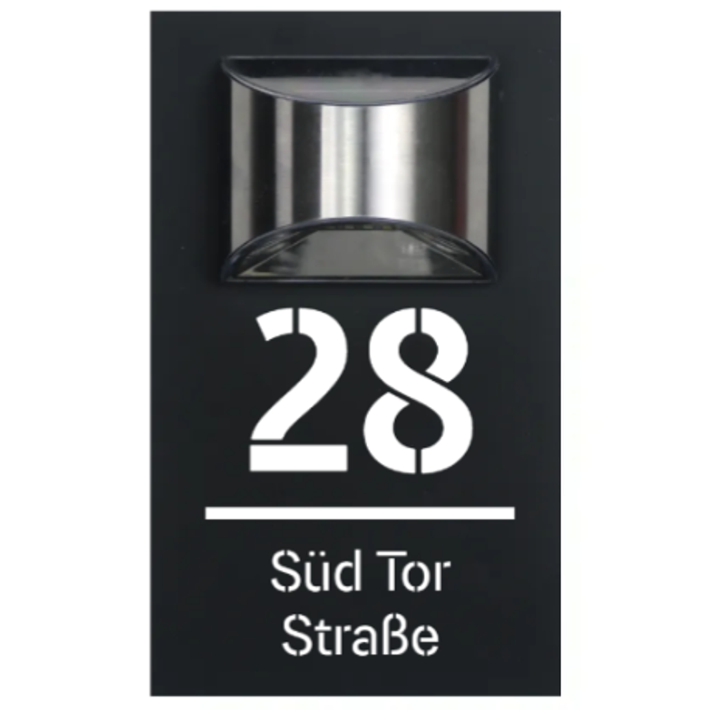 Dieses Hausschild besteht aus langlebigen Materialien und integriert nahtlos Solartechnologie. Personalisieren Sie es mit Ihrer Hausnummer und Ihrem Straßennamen.